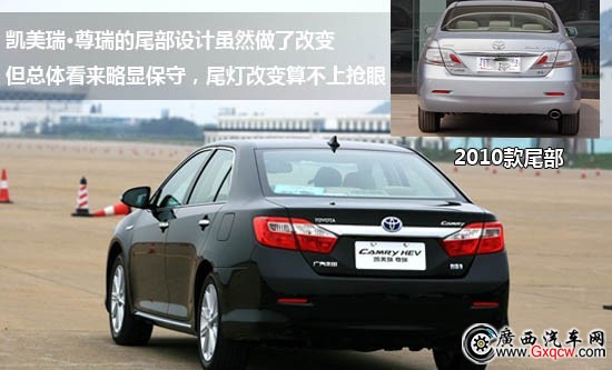 凱美瑞·尊瑞混動車型外觀設(shè)計與其普通車型區(qū)別不大,僅是進(jìn)氣格柵上的豐田L(fēng)OGO加入了淡藍(lán)色,且尾部加入HSD標(biāo)識。