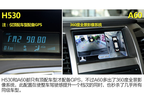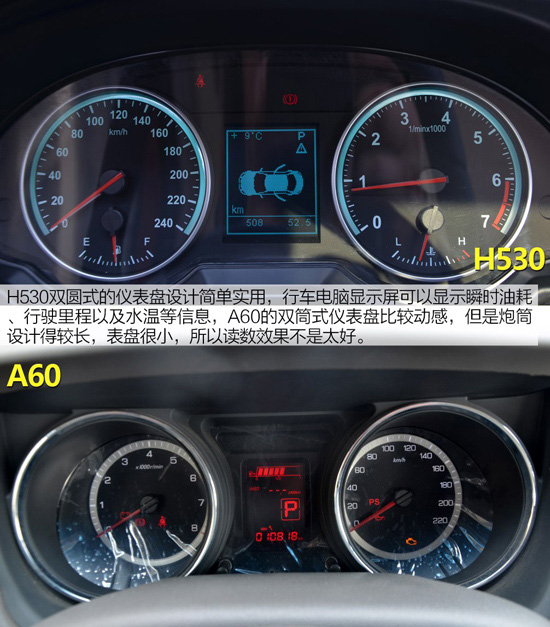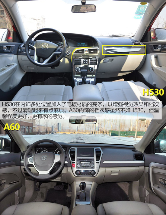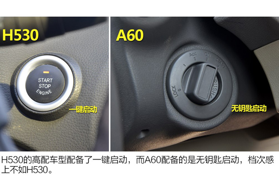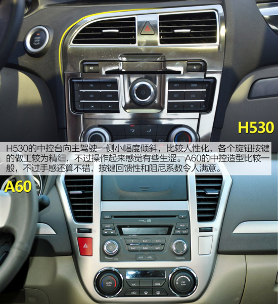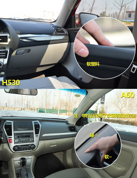 H530的內(nèi)部用料很厚道,中控臺(tái)大面積的使用軟塑料,視覺(jué)效果和觸感都很優(yōu)秀,而A60中控臺(tái)采用了軟硬搭配的方法,乘坐者容易觸及的部分采用的是硬塑料,質(zhì)感比較一般。