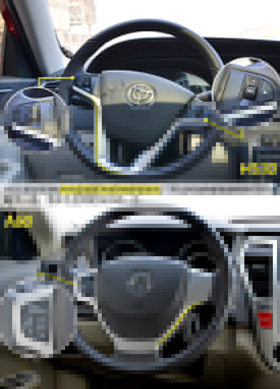 H530的三幅式方向盤手感偏硬,標(biāo)配的多功能按鍵集成的功能比較簡(jiǎn)單,只有音響控制和行車電腦,定速巡航、藍(lán)牙電話等功能只出現(xiàn)在高配車型上。A60的方向盤相比H530來(lái)說(shuō),手感要細(xì)膩不少,雖然多功能按鍵不是標(biāo)配,但只有入門車型是塑料方向盤,其它車型均為皮質(zhì)包裹。