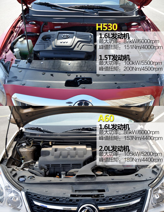 H530搭載的是1.6L自然吸氣和1.5T渦輪增壓發(fā)動機(jī),而A60搭載的是1.6L和2.0L兩款自然吸氣發(fā)動機(jī),動力參數(shù)上,1.6L車型的比較中,H530的最大功率高于A60,但峰值扭矩不如A60,而H530的1.5T發(fā)動機(jī)與A60的2.0L發(fā)動機(jī)比較的結(jié)果正好想反,H530的最大功率不如A60,峰值扭矩優(yōu)于A60。不過要比較發(fā)動機(jī)的知名度和品質(zhì),A60要遠(yuǎn)優(yōu)于H530,因?yàn)锳60的發(fā)動機(jī)來自日產(chǎn),打開發(fā)動機(jī)蓋,“NISSAN”LOGO清晰可見,而H530的自然吸氣發(fā)動機(jī)是三菱的落后技術(shù),渦輪增壓發(fā)動機(jī)則是自主研制,各方面都遜色于A60。