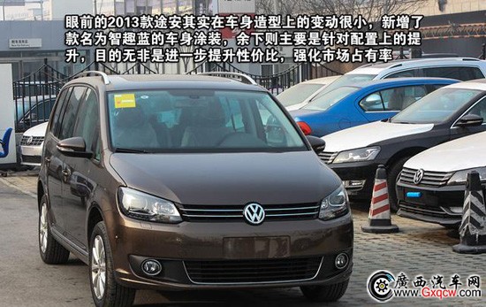 2013款途安的官方指導(dǎo)售價(jià)為14.98-21.18萬(wàn)元,并推出了搭載1.4TSI發(fā)動(dòng)機(jī)的共計(jì)9款不同配置的車型。2013款車型最大的變化是在老款的基礎(chǔ)上新增了較為豐富的配置,同時(shí)還新增了智臻白、智趣藍(lán)兩種車身顏色。