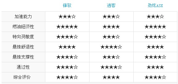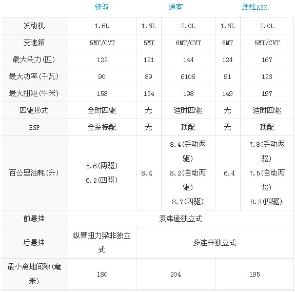 逍客和勁炫ASX均提供了1.6升和2.0升兩種自然吸氣發(fā)動(dòng)機(jī)的動(dòng)力選擇,變速箱也均使用了手動(dòng)和CVT的組合,稍有不同的是,逍客的2.0升車型采用了6速手動(dòng)變速箱。和鋒馭不同的是,逍客和勁炫ASX都使用了多連桿式的獨(dú)立后懸掛,但1.6升車型均無(wú)四驅(qū)功能,且四驅(qū)形式均為適時(shí)四驅(qū),相較鋒馭的全時(shí)四驅(qū),四驅(qū)能力似乎顯得不夠強(qiáng)大。既然我們是對(duì)比,出于公平以及文章現(xiàn)實(shí)意義的考慮,我們只對(duì)1.6升車型進(jìn)行對(duì)比,下文中若無(wú)特殊說明,所說的逍客和勁炫ASX均指其1.6升的版本。