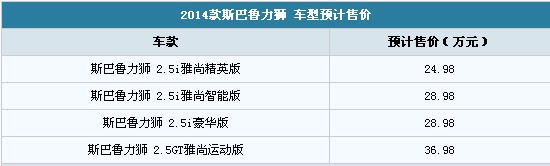 近日,網絡中曝光了斯巴魯2014款力獅的價格,新車總共推出4款車型,預計售價區(qū)間為24.98-36.98萬元。 (注:該價格非最終官方售價,最終車型價格還是以官方公布為準。)