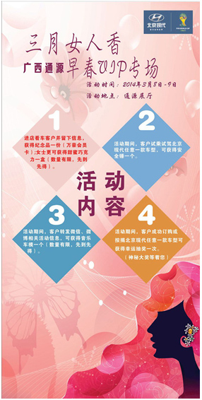 濃情三月婦女節(jié),放下你手上的鍋碗瓢盆,拋棄柴米油鹽,來(lái)廣西通源北京現(xiàn)代放飛你的心情領(lǐng)取甜蜜禮品吧!