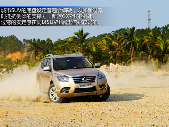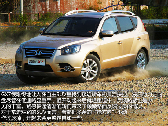 一般來說,城市SUV的底盤設(shè)定普遍會偏硬,以加強(qiáng)過彎時抵抗側(cè)傾的支撐力,新款GX7也不例外。過彎的安定感在同級SUV里屬于信心較好的。GX7很難得地讓人在自主SUV里找到接近轎車的靈活操控。液壓助力方向盤盡管在低速略顯重手,但開動起來后就輕重適中,反饋路感也是少見的豐富。路感傳遞清晰的轉(zhuǎn)向帶來了顛簸路面反饋過多的情況,對于常走爛路的SUV而言,若能把多余的“搶方向”小動作過濾掉,開起來會更淡定自如一些。