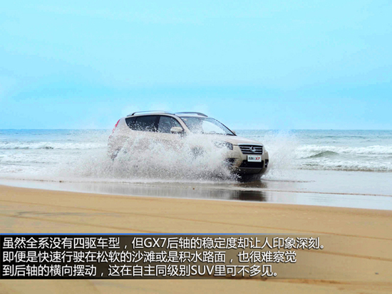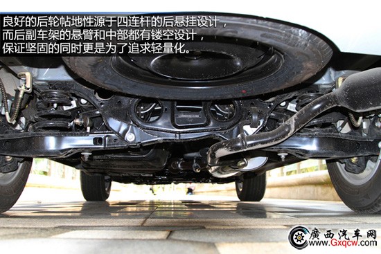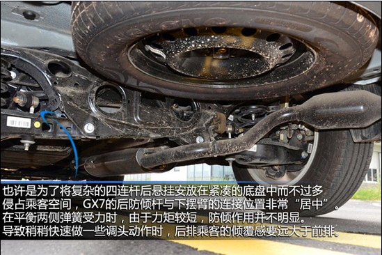 雖然全系沒有四驅(qū)車型,但GX7后軸的穩(wěn)定度卻讓人印象深刻。即便是快速行駛在松軟的沙灘或是積水路面,也很難察覺到后軸的橫向擺動,這在自主同級別SUV里可不多見。良好的后輪帖地性源于四連桿的后懸掛設(shè)計,而后副車架的懸臂和中部都有鏤空設(shè)計,保證堅固的同時更是為了追求輕量化。也許是為了將復(fù)雜的四連桿后懸掛安放在緊湊的底盤中而不過多侵占乘客空間,GX7的后防傾桿與下擺臂的連接位置非!熬又小薄T谄胶鈨蓚(cè)彈簧受力時,由于力矩較短,防傾作用并不顯。導(dǎo)致稍稍快速做一些調(diào)頭動作時,后排乘客的傾覆感要遠(yuǎn)大于前排。