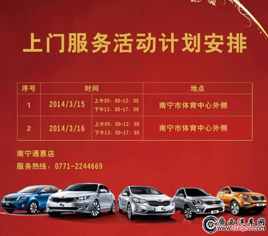 東風悅達起亞南寧通惠4S店為回饋廣大新老用戶,為消費者帶去實實在在的便利與溫情,特別開展春季上門服務,在馬年的春天,以用心、專心的溫情服務,為您帶來新一年的一份感動。暖暖濃情,給您送上家人般的關懷。東風悅達起亞南寧通惠4S店定于3月15、16日開展上門服務活動,開展地點:南寧市體育中心外側。詳詢:400-922-0771 轉8128