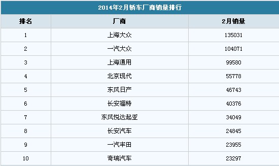 汽車廠商排名上,上海大眾、一汽大眾和上海通用繼續(xù)霸占著前三甲的位置,其中上海大眾3萬余臺的領(lǐng)先優(yōu)勢較為明顯,而一汽大眾和上海通用的車距則不到五千臺。4-6名的車型排位和1月一樣保持不變,分別是北京現(xiàn)代、東風(fēng)日產(chǎn)和長安福特。此外,東風(fēng)悅達(dá)起亞和長安汽車和1月表現(xiàn)相當(dāng),都僅下滑一位。而神龍汽車和一汽豐田的轎車銷量則在2月有所提升,擠上了榜單。