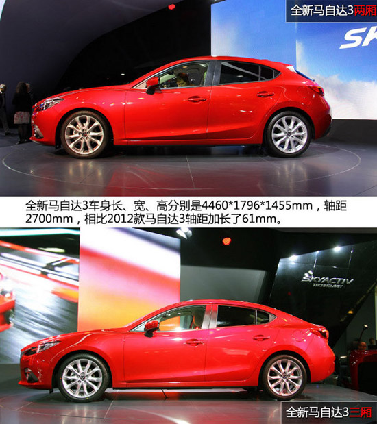 從前引擎罩延伸的硬朗線條與由尾部伸向腰身的極具雕刻感線條相互交叉于腰身中部,加上由前翼子板向尾部延伸的線條匯集至后翼子板初,腰身線條感明確,運動感十足。全新馬自達3車身長、寬、高分別是4460*1796*1455mm,軸距2700mm,相比2012款馬自達3軸距加長了61mm。