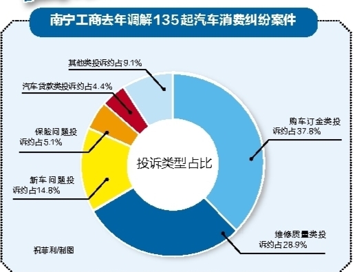 近日,記者從南寧工商專(zhuān)業(yè)市場(chǎng)分局獲悉,去年該局共調(diào)解處理了汽車(chē)消費(fèi)申訴案例135起,其中購(gòu)車(chē)訂金成為汽車(chē)投訴最集中的問(wèn)題,其他為維修質(zhì)量、新車(chē)問(wèn)題、汽車(chē)金融等。為此,南寧工商部門(mén)有關(guān)人士對(duì)去年汽車(chē)消費(fèi)投訴情況進(jìn)行了詳細(xì)分析
