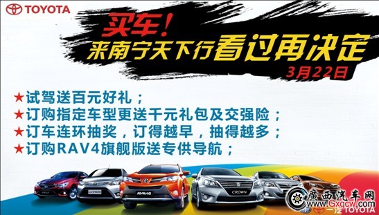 3月春季特惠又將掀起又一波狂潮,3月22日,南寧天下行豐田為您全新推出購車特惠季,來南寧天下行豐田不僅能享受到前所未有的購車特惠,還將享受到不一樣的過車樂趣!因此,買豐田,來南寧天下行豐田看過再?zèng)Q定!絕對(duì)讓您不虛此行,絕對(duì)讓您乘興而來,滿意而歸!