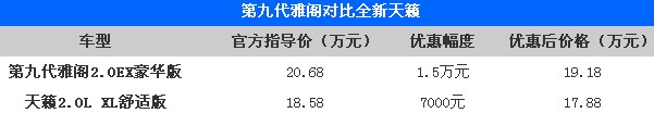 從公平角度兼顧2.0L中配的原則,我們選擇了雅閣2014款 2.0L EX 豪華版和天籟2013款 2.0L XL舒適版, 指導(dǎo)售價分別為20.68萬元和18.58萬元。盡管兩車存在2.1萬元售價區(qū)別,但雅閣目前擁有1.5萬元左右優(yōu)惠,而天籟則有7000元的讓利,綜合來看,已經(jīng)比較接近了。至于具體行情,請消費者聯(lián)系當?shù)亟?jīng)銷商確認。
