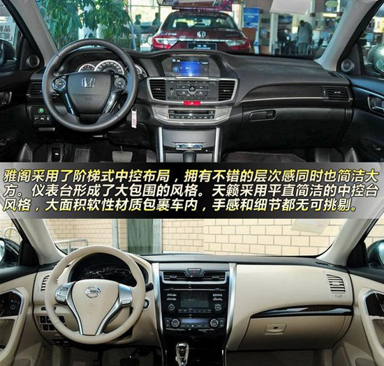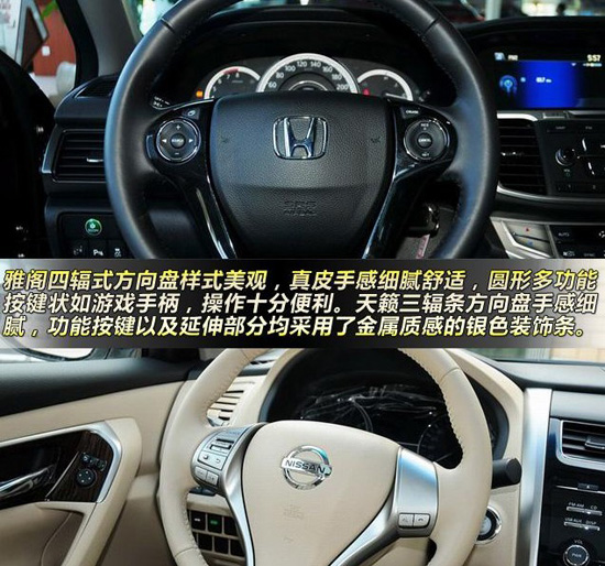 方向盤(pán)方面,雅閣四輻式方向盤(pán)樣式美觀(guān),真皮手感細(xì)膩舒適,圓形多功能按鍵狀如游戲手柄,操作十分便利。天籟三輻條方向盤(pán)手感細(xì)膩,功能按鍵以及延伸部分均采用了銀色裝飾條,不但看上去層次分明,也帶來(lái)了一些金屬質(zhì)感。