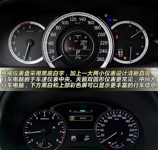 儀表方面,雅閣的儀表盤(pán)采用黑底白字,加上一大兩小的儀表設(shè)計(jì)清晰直觀(guān)。行車(chē)電腦嵌于車(chē)速儀表中央,涵蓋了行駛里程、瞬時(shí)油耗等信息。更多的行車(chē)信息就交給中控臺(tái)上方的彩色屏幕顯示。天籟雙圓形儀表更加常見(jiàn),中間為行車(chē)電腦區(qū)域,下方黑白屏顯示擋位和油耗等最常用的信息,彩色則可以顯示更豐富的行車(chē)信息。從儀表觀(guān)感和設(shè)計(jì)來(lái)看,天籟要比雅閣更為符合多數(shù)人的用車(chē)習(xí)慣,效果也更為出眾。