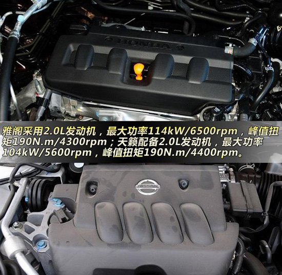天籟采用了一臺代號MR20DE的2.0L發(fā)動機,具備C-VTC連續(xù)可變氣門正時功能,最大功率104kW/5600rpm,峰值扭矩190N.m/4400rpm,扭矩與雅閣一致,功率稍低,但是最大功率轉(zhuǎn)速卻比雅閣提前了900轉(zhuǎn),這臺發(fā)動機優(yōu)勢工作狀態(tài)比較平穩(wěn)安靜,同時工信部油耗為7.3升,比雅閣稍低。這臺發(fā)動機也不挑食,93號(京92)號汽油完全足夠。