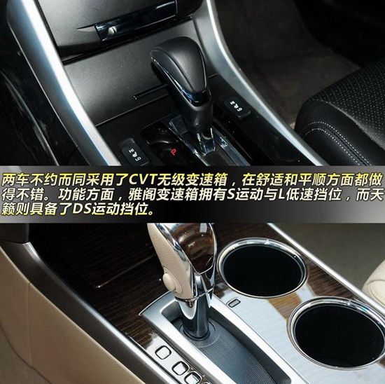 變速箱方面,兩車不約而同采用了CVT無級變速箱,在舒適和平順方面都做得不錯。功能方面,雅閣變速箱擁有S運動與L低速擋位,而天籟則具備了DS運動擋位。