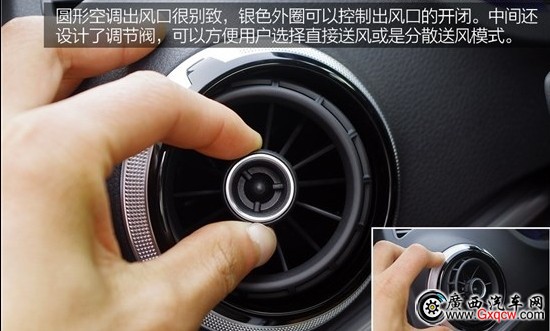 圓形空調(diào)出風(fēng)口很別致,銀色外圈可以控制出風(fēng)口的開閉。中間還設(shè)計(jì)了調(diào)節(jié)閥,可以方便用戶選擇直接送風(fēng)或是分散送風(fēng)模式。