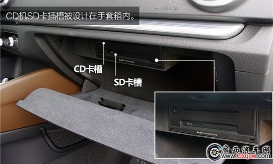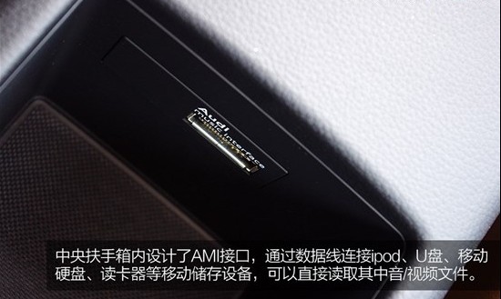 為了讓中控更加簡(jiǎn)潔,CD機(jī)被放在手套箱內(nèi),同時(shí)還有SD卡插槽。中央扶手箱內(nèi)設(shè)計(jì)了AMI接口,通過數(shù)據(jù)線連接iPod、U盤、移動(dòng)硬盤、讀卡器等移動(dòng)儲(chǔ)存設(shè)備,可以直接讀取其中音/視頻文件,為駕駛?cè)藛T提供精彩的數(shù)碼娛樂方式。