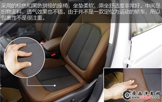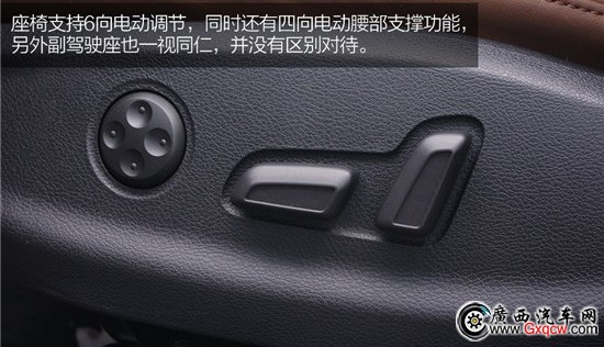 采用的是棕色和黑色拼接的座椅,坐墊柔軟,乘坐舒適度非常好。中間是織物面料,透氣效果也不錯(cuò)。由于并不是一款定位為運(yùn)動(dòng)的轎車(chē),所以包裹性不是很注重。座椅支持6向電動(dòng)調(diào)節(jié),同時(shí)還有四向電動(dòng)腰部支撐功能,另外副駕駛座也一視同仁,并沒(méi)有區(qū)別對(duì)待。
