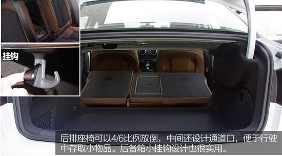 全新奧迪A3三廂版后備箱容積為425L,后備箱比較規(guī)整,儲(chǔ)物空間在同級(jí)別中不算差。后排座椅可以4/6比例放倒,中間還設(shè)計(jì)通道口,便于行駛中存取小物品。另外,后備箱小掛鉤設(shè)計(jì)也很實(shí)用。