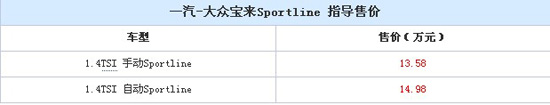 2014年3月24日, 一汽-大眾宣布寶來(lái)Sportline車(chē)型正式上市銷(xiāo)售。此次推出的寶來(lái)Sportline共有2款車(chē)型,分別為1.4T手動(dòng)豪華版和1.4T自動(dòng)豪華版,有幻影黑、極地白、炫酷灰、旋風(fēng)紅四款顏色供消費(fèi)者選擇。官方公布的價(jià)格為13.58萬(wàn)-14.98萬(wàn)。