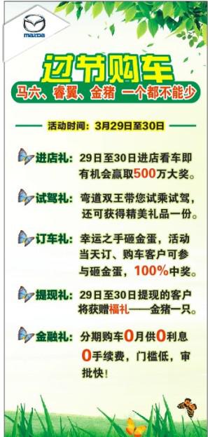 1、進(jìn)店禮:26日至31日來鑫廣達(dá)一汽馬自達(dá)看車即有機(jī)會(huì)獲500萬大獎(jiǎng);