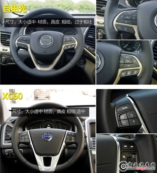 同樣是三輻式方向盤(pán),同樣都采用了皮質(zhì)包裹,大小也相當(dāng)。不同之處是自由光方向盤(pán)設(shè)計(jì)的較為為粗壯,就個(gè)人體驗(yàn)而言,XC60方向盤(pán)握感剛好,自由光方向盤(pán)就有稍有些粗壯,對(duì)于我這樣一個(gè)手不大的人來(lái)說(shuō),感覺(jué)有些握不過(guò)來(lái)。當(dāng)然,對(duì)于一些手掌大的駕駛者來(lái)說(shuō),他們可能會(huì)更喜歡自由光的握感。兩車方向盤(pán)上都集成了多功能按鍵,自由光顯然要更為豐富。