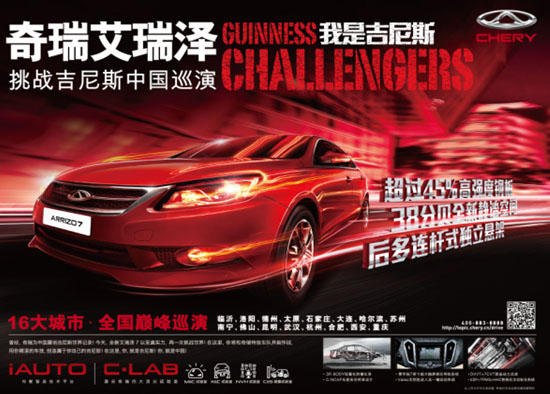 日前,據(jù)奇瑞汽車透露,2014年“我是吉尼斯——奇瑞艾瑞澤挑戰(zhàn)吉尼斯中國巡演”即將啟程。作為今年奇瑞汽車四大巡演之一,奇瑞艾瑞澤挑戰(zhàn)吉尼斯中國巡演于4月10日-6月21日展開,活動囊括國內(nèi)16座大中城市,預(yù)計吸引到場觀眾超萬人。屆時,奇瑞特技車隊將首次駕駛艾瑞澤7挑戰(zhàn)特技科目,再現(xiàn)“兩車同時漂移入位”最小吉尼斯世界紀錄——43CM精彩一刻。同時,巡演還特別面向公眾招募特技車手,讓普通人也有機會駕駛艾瑞澤7參與挑戰(zhàn),用精湛的技術(shù)創(chuàng)造屬于自己的吉尼斯!