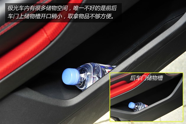 儲物空間方面,極光車廂內(nèi)有多個(gè)杯架、儲物槽可供使用。車子后備廂空間應(yīng)付自駕游也沒問題。后備廂在后排在有乘客的情況下,容積為575L。如果把后排座椅放倒,后備廂深度增加為1580mm,容積提升至1445L,非常夠用。高配車型還有電動尾門。總之在空間方面,極光滿足基本需求已經(jīng)綽綽有余。