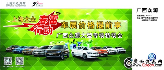 廣西眾源榮獲“上海大眾全國四星級經(jīng)銷商”余熱不減,廣西眾源再次完成一季度銷量目標,榮膺金源集團汽車4S店一季度冠軍獎!4月12-13日,上海大眾廣西眾源“春雷行動”即將盛大上演,讓您提前享受超越車展優(yōu)惠價;顒悠陂g蒞臨秀廂大道199號金源國際汽車城D區(qū)——廣西眾源4S店展廳。