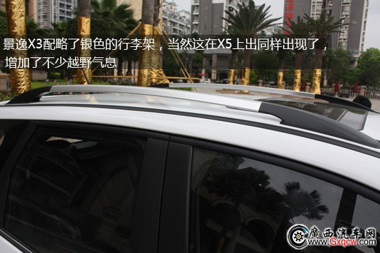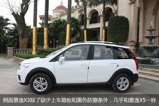 從車身側(cè)面來(lái)看,景逸X3除了缺少上車踏板和大面積的黑色防擦條外,幾乎和景逸X5如出一轍。