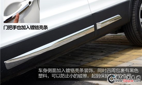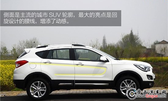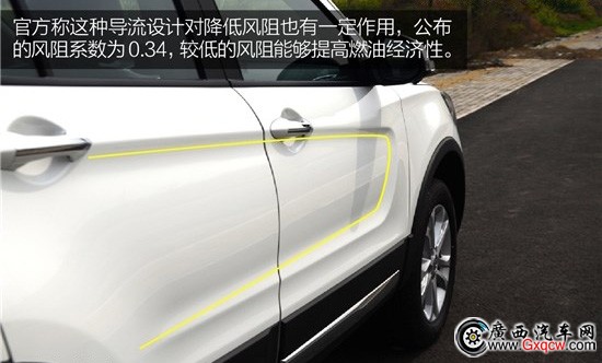 側(cè)面是主流的城市SUV造型,最大的亮點(diǎn)是回旋設(shè)計(jì)的腰線,看上去立體感很強(qiáng)。而官方稱這種導(dǎo)流設(shè)計(jì)對(duì)降低風(fēng)阻也有一定作用,公布的風(fēng)阻系數(shù)為0.34,較低的風(fēng)阻系數(shù)能夠提高燃油經(jīng)濟(jì)性。