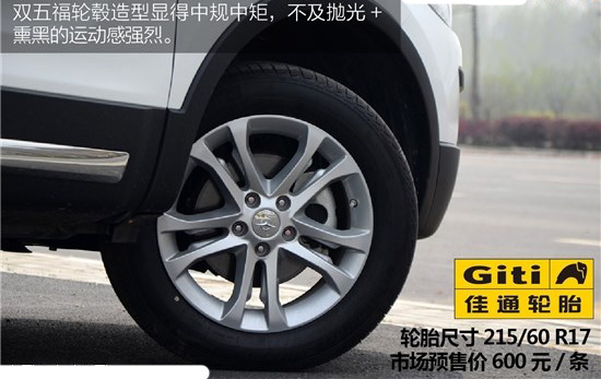 我們實(shí)拍的海馬S5配備的是佳通 SUV 520系列輪胎,尺寸為215/60 R17,是一款兼顧靜音和舒適性的輪胎,市場預(yù)售價(jià)大約600元/條。雙五福輪轂造型顯得中規(guī)中矩,不及拋光+熏黑的運(yùn)動(dòng)感強(qiáng)烈。