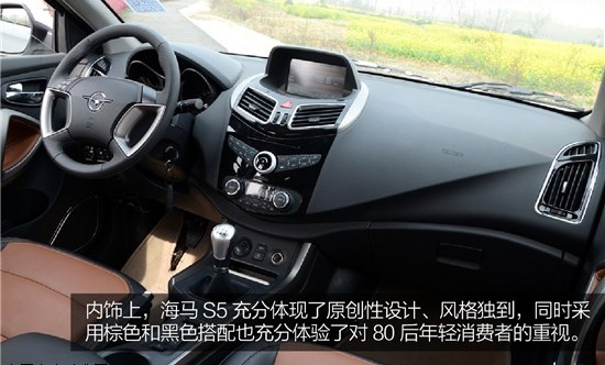 內(nèi)飾上,海馬S5充分體現(xiàn)了原創(chuàng)性設(shè)計,造型新穎、立體,有自己獨到的風(fēng)格,V字型的布局也讓整個內(nèi)飾不會顯得平淡。配色上采用棕色和黑色搭配,是年輕消費者喜歡的主流配色。