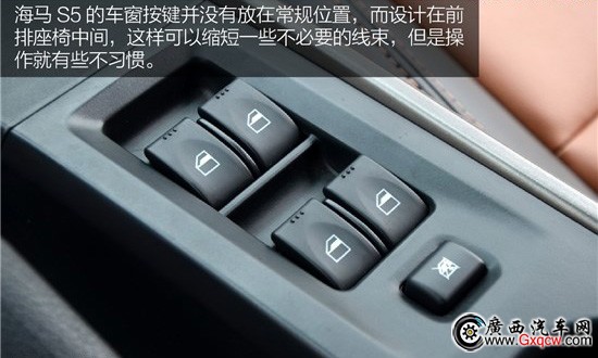 在試駕過程中我們發(fā)現(xiàn)海馬S5的車窗按鍵并沒有放在常規(guī)位置,而設(shè)計在前排座椅中間,這樣可以縮短一些不必要的線束,但操作就有些不習(xí)慣。