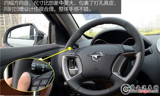 四幅方向盤樣式,尺寸比想象中要大,包裹打孔真皮,同時凹槽設(shè)計也很合理,整體手感不錯。多功能按鍵的設(shè)計也在拇指能夠輕松觸控的范圍內(nèi),非常方便。另外,方向盤還支持上下調(diào)節(jié)功能。