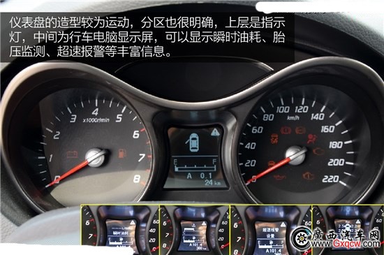 儀表盤的造型較為運動,分區(qū)也很明確,上層是指示燈,中間為行車電腦顯示屏,可以調(diào)節(jié)顯示瞬時油耗、胎壓監(jiān)測、超速報警等豐富信息。紅色指針和白色字體構(gòu)成的儀表清晰度較高,我想這也是用戶最為關(guān)注的一點。