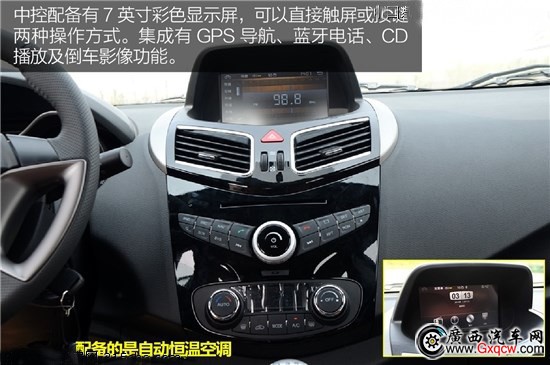 中控配備有7英寸彩色顯示屏,可以直接觸屏或按鍵兩種操作方式。集成有GPS導(dǎo)航、藍牙電話、CD播放及倒車影像功能。另外,采用的是恒溫自動空調(diào),可以在18-32度的溫度區(qū)間自由調(diào)節(jié)。