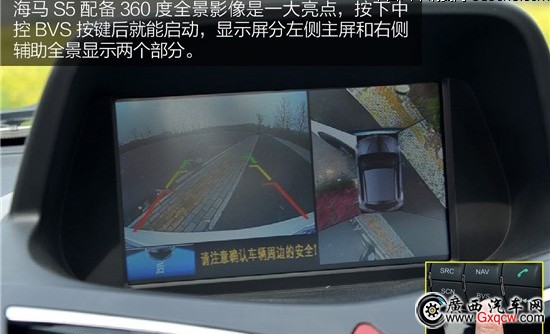 作為一大亮點,海馬S5在高配車型配備360度全景影像,按下中控BVS按鍵后就能啟動,顯示屏分左側(cè)主屏和右側(cè)輔助全景顯示兩個部分。另外,在車速低于20Km/h時撥動轉(zhuǎn)向燈,顯示屏立即會顯示左側(cè)(右側(cè))的畫面,當(dāng)然掛入倒檔時也會顯示后方圖像。