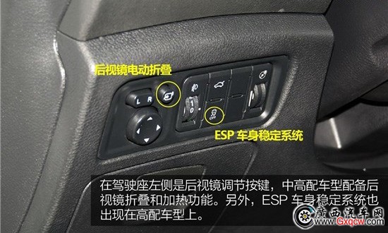 在駕駛座左側(cè)是后視鏡調(diào)節(jié)按鍵,中高配車型還配備后視鏡折疊和加熱功能。另外,配備ESP車身穩(wěn)定系統(tǒng)也是我們非常喜歡的配置,只不過只有高配車型才有配備。