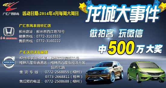 你拍,我拍,大家拍。為滿足拍客們的需求,廣匯沃爾沃柳州弘耀4S店與廣匯東風(fēng)本田4S店求,廣匯沃爾沃柳州弘耀4S店位于龍城路工商銀行旁空地開展拍客大賽?纯凑l能拍 中500萬大獎。