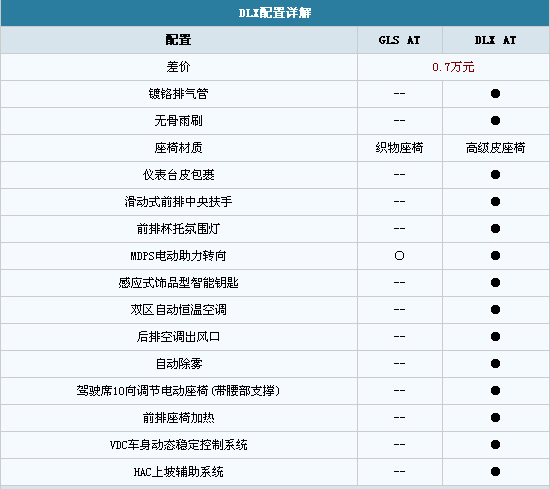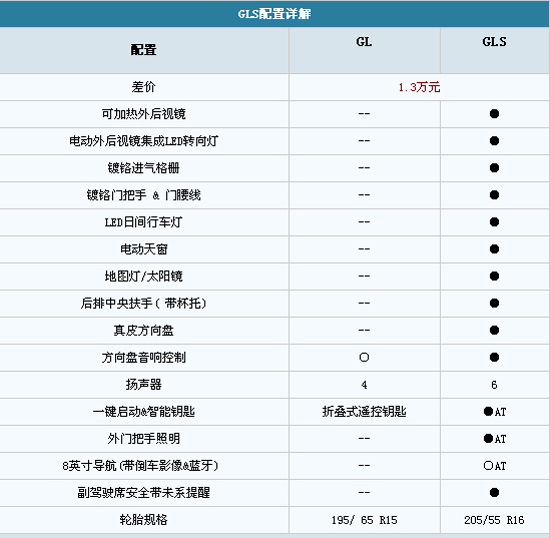GLS比GL貴了1.3萬元,不僅增加了LED日間行車燈、電動外后視鏡集成LED轉(zhuǎn)向燈、可加熱外后視鏡等外觀配置,內(nèi)飾也加入了真皮方向盤、地圖燈/太陽鏡以及電動天窗。低配中僅能選裝的方向盤音響控制從GLS車型開始成為標(biāo)準(zhǔn)配備,原先的15寸輪轂升級為16寸,揚(yáng)聲器數(shù)量也從4個提升為6個。另外自動擋車型還有一鍵啟動、外門把手照明和副駕駛安全帶未系提醒配置,8英寸導(dǎo)航則兩車都只能選裝。