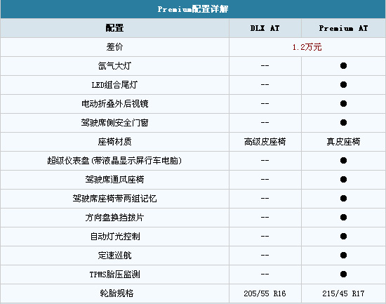 最后我們來看一下這款頂配車型,售價 14.38萬,相比DLX車型貴了1.2萬元。方向盤換擋撥片、定速巡航、TPMS胎壓監(jiān)測、氙氣大燈、LED組合尾燈、駕駛席通風(fēng)座椅等配置如數(shù)出現(xiàn)在這款車型上。另外還升級了座椅為真皮材質(zhì),輪胎也變?yōu)?7寸,提升了視覺感受。