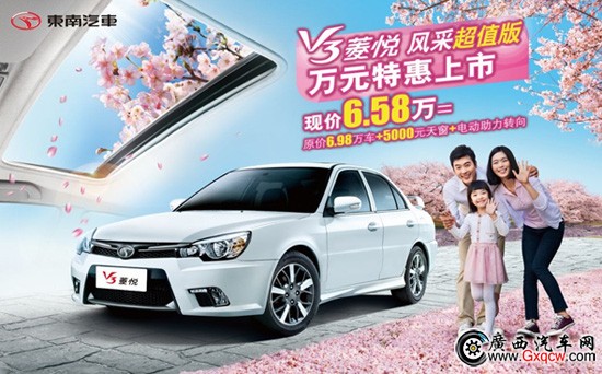 記者從東南汽車南寧鉻典4S店了解到,日前,作為國(guó)內(nèi)家轎的佼佼者,東南V3菱悅改款車型——風(fēng)采超值版攜電動(dòng)天窗、智能無鑰匙進(jìn)入/啟動(dòng)系統(tǒng)、電動(dòng)助力轉(zhuǎn)向、運(yùn)動(dòng)側(cè)裙尾翼、賽車化桶型座椅、多功能方向盤等超豐富配置加值上市,目前現(xiàn)車已到南寧。據(jù)介紹,V3菱悅風(fēng)采超值版繼續(xù)保持了V3菱悅一貫的親民特性,在價(jià)格上表現(xiàn)出了足夠的誠(chéng)意,僅售6.58萬元,在增加了價(jià)值5000元電動(dòng)天窗以及增配電動(dòng)助力轉(zhuǎn)向等優(yōu)質(zhì)配置的同時(shí),價(jià)格方面還比之前的風(fēng)采版車型優(yōu)惠了4000元,現(xiàn)在購(gòu)車還享3000元大禮包,真正實(shí)現(xiàn)萬元特惠上市。我們有理由相信,這一次的增配特惠上市,將為V3菱悅贏得了更多的市場(chǎng)口碑,鞏固V3菱悅在家轎市場(chǎng)“性價(jià)比之王”的美譽(yù)。