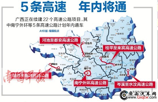 我區(qū)5條高速公路有望年內(nèi)建成通車,分別是南寧外環(huán)、河池至都安、靖西至那坡、岑溪至水汶、桂平至來賓高速路