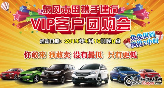 2014年4月16日晚8點,東風本田柳州華匯店攜手建行柳州分行在展廳舉辦“VIP客戶團購會”活動,特為廣大客戶提供一場現(xiàn)場購車盛會。現(xiàn)場購車可享特惠團購價,活動現(xiàn)場精彩紛呈!還等什么,馬上行動起來,東風本田專業(yè)銷售顧問全程為您提供購車建議!幫助您理性選車!輕松購車。