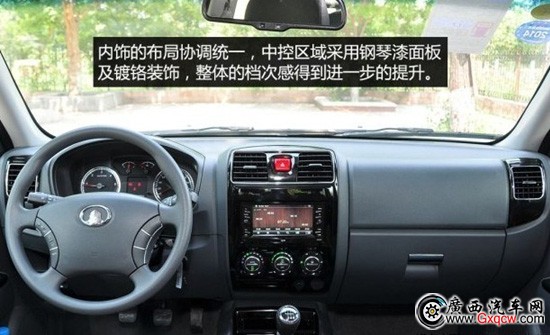 長城M4的內(nèi)飾以黑色為主打設(shè)計,配以銀色面板裝飾。傳統(tǒng)的時速表也改為液晶屏幕,并可以顯示油耗,里程等行車信息。M4采用了多功能方向盤,并標配12V車載電源、USB和AUX外置音源接口、大燈高度可調(diào)等,高配車型還配備了MP5+GPS+倒車影像+倒車雷達的多媒體組合。在同級車中內(nèi)部配置相對豐富。
