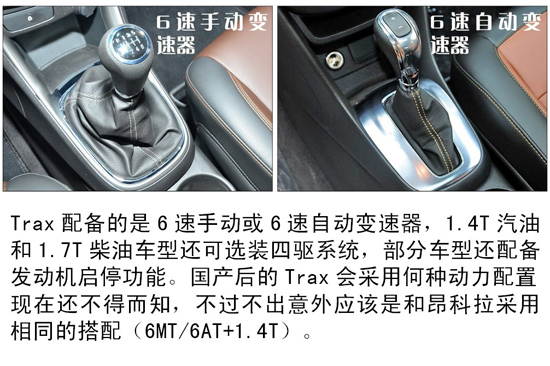 TRAX創(chuàng)酷動力方面預(yù)計搭載與昂科拉相同的1.4T發(fā)動機,最大功率103kw(140Ps),最大扭矩200Nm,傳動系統(tǒng)將匹配6速手動或6速自動變速箱加以匹配。此外新車還有望搭載一款1.6L自然吸氣發(fā)動機,而與之匹配的是5速手動或6速自動變速箱。