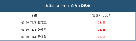 在本屆北京車(chē)展上,一汽-大眾奧迪正式宣布旗下Q3 30 TFSI車(chē)型上市,新車(chē)的售價(jià)為24.98-28.98萬(wàn)元,詳細(xì)價(jià)格信息請(qǐng)見(jiàn)下表: