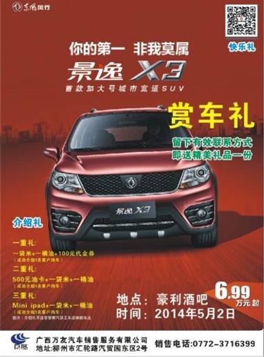 《景逸X3之夜,你的第一,非“我”莫屬》屆時,將有人體彩繪藝術(shù)表演、景逸特約模特走秀、各種勁舞表演及精彩互動活動。口號:“我愛您,景逸X3,我的第一次”憑近期在廣西萬友風(fēng)行專營店的景逸X3訂單,獲贈5月2日晚,豪利酒吧的兩打價值776元的啤酒+果盤1份+爆米花1份。
